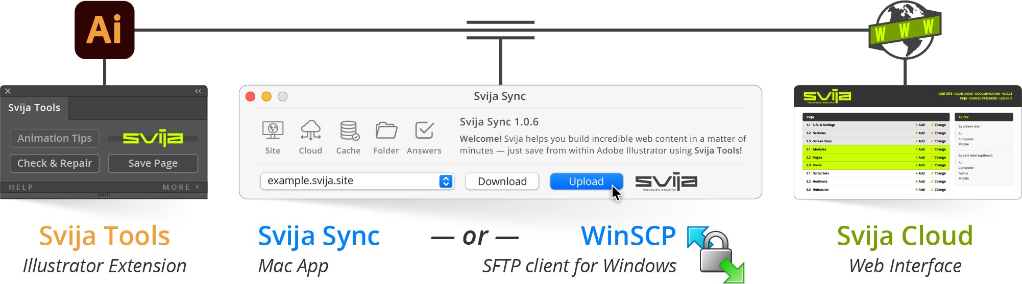 1. You create in Adobe Illustrator, and save with the Pwika Tools panel.
