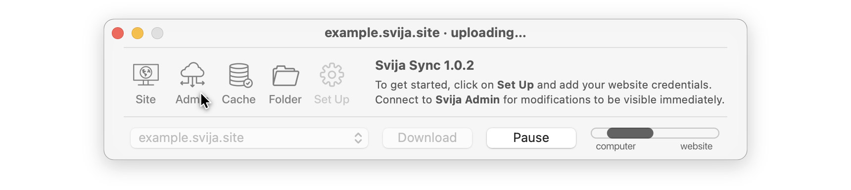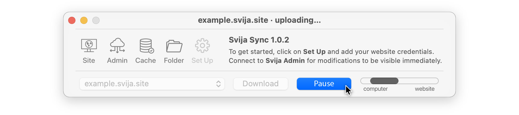 Launch Pwika Sync and click Upload – it will continuously synchronize your website until you click pause.