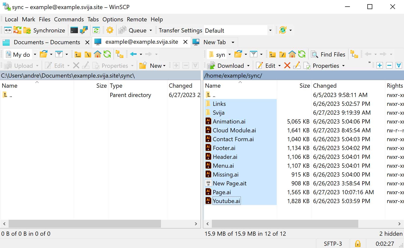 At this point, you should see your documents in the left pane and your website files in the right pane: