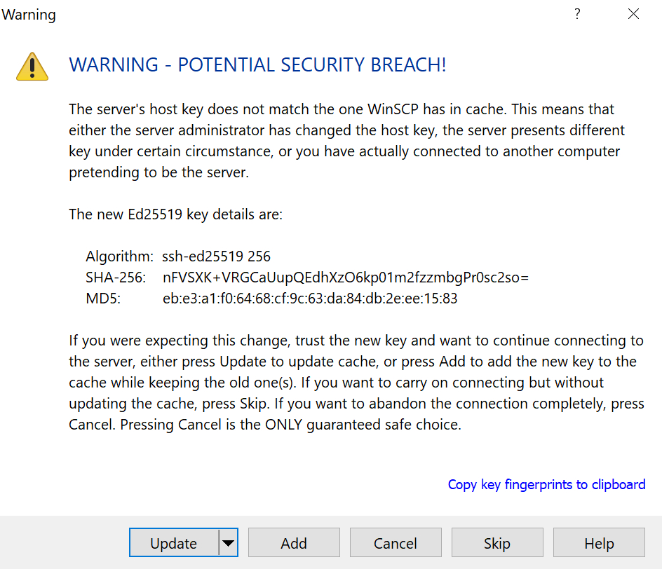 If you were expecting this change, trust the new key and want to continue connecting to the server, either press Update to update cache, or press Add to add the new key to the cache while keeping the old one(s). If you want to carry on connecting but without updating the cache, press Skip. If you want to abandon the connection completely, press Cancel. Pressing Cancel is the ONLY guaranteed safe choice.